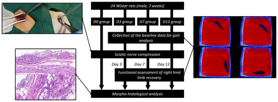 The overview of the experimental protocol was illustrated in Figure 2. Twenty-four Wistar rats were first divided into four different subgroups according to the different time points (D0, D3, D7, and D13) respectively, with six rats in each group. In each group, the six rats were further divided into two subgroups, including the ‘soft gripper’ subgroup and the ‘haemostats’ subgroup, with three rats in each subgroup. The baseline data for gait analysis of the rats in D3, D7, and D13 groups were collected prior to the surgery.