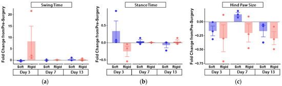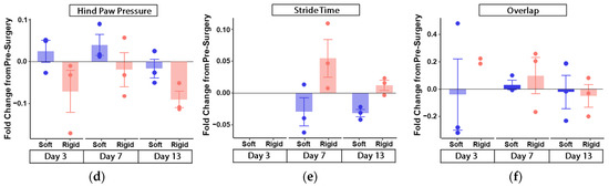 We were not able to record accurate measures of stride time at post-surgery day 3, as such, have only shown the data for days 7 and 13. Here, we observed that the soft gripper group showed a negative fold-change from pre-surgery, whereas the rigid gripper group showed a positive change from pre-surgery (illustrated in Figure 5e) at both days 7 and 13 post-surgery. We did not observe much difference between pre-surgery and post-surgery overlap across both groups (illustrated in Figure 5f).