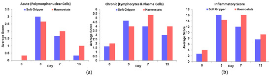 From the experimental results, the extent of acute and chronic inflammatory cell infiltrate generally appeared less severe in the ‘soft gripper’ group than the ‘haemostats’ group, as observed by the relatively lower average acute and chronic scores on Day 0, 7 and 13 (shown in Figure 6a). Moreover, it was important to note that the ‘haemostats’ group exhibited acute inflammatory response at Day 0, but not for the ‘soft gripper’ group. Although both the groups had similar types of inflammatory cells present, the extent of inflammation in the ‘soft gripper’ group seemed to peak earlier at Day 3 and dwindle thereafter, while the extent of inflammation in the ‘haemostats’ group seemed to persist from Day 3 onwards with relatively higher inflammatory scores than the ‘soft gripper’ group at Day 7 and 13 (illustrated in Figure 6b).