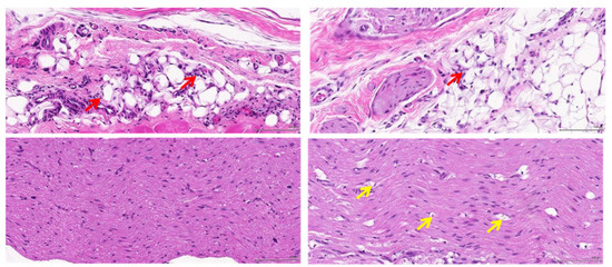 Based on the histopathological findings, while inflammation and fibrosis were variably present among samples and often focused on suture sites (foreign-body reaction), there appeared to be a visible difference in the degree of axonal vacuolar degeneration between the groups, which could suggest the presence of substantial nerve damage in the ‘haemostats’ group. Figure 8 and Figure 9 presented the mild and moderate inflammation and fibrosis caused by the ‘soft gripper’ and ‘haemostats’ groups at D13.