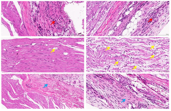There is moderate inflammation and fibrosis present and mild axonal degeneration at the grip sites by the haemostats: (Histopathological findings at D13, 20×, H&E, Inflammatory cell infiltrate (red arrow), Axonal degeneration (yellow arrow), Fibrosis (blue arrow)).