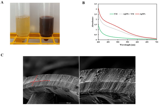 Two layers are clearly visible in the cross-section of the SEM film photomicrographs (Figure 1C). In addition, after adding yerba mate extract with nanoparticles, silver nanoparticles were clearly visible in the SEM photomicrographs (Figure 1D).