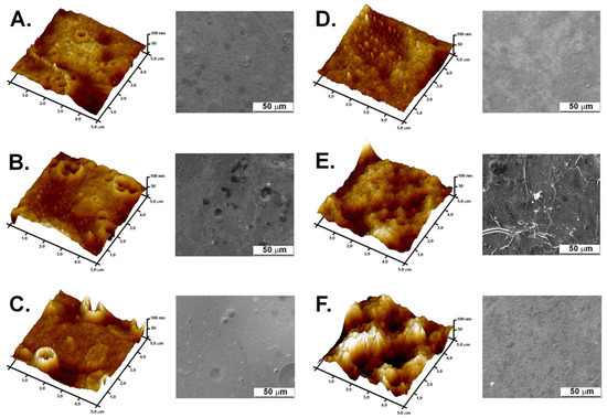 SEM and AFM images of: (A) composite No. 1; (B) composite No. 2; (C) composite No. 3; (D) FUR/CHIT+HGEL; (E) FUR+CUR-REO; and (F) FUR+AgNPs-YM.