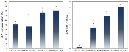 The hydrophobicity of the film was tested by measuring the water contact angle (WCA) on the surface of the film (Table 2). In order to evaluate the hydrophobic/hydrophilic nature of the films, WCA was tested separately for the FUR and for the CHIT+HGEL layers. The mean WCA value of the FUR layer in the control film was 90.08°, which proves its high hydrophobicity [42]. The introduction of the active ingredients caused a significant decrease in the WCA value (down to 24.40°), resulting in a strong hydrophilic nature of the film. Moreover, the addition of the active ingredients to the FUR layer influenced the WCA values of the CHIT+HGEL layer. The WCA value decreased, which contributed to the deterioration of the film’s hydrophobic nature. The recorded decrease may be due to the porosity and roughness of the obtained composite film. In addition, the surface roughness also affects the hydrophilic nature of the material [41]. Thus, the obtained result is consistent with the analysis of the microstructure of the obtained films (Figure 2). The presented films of a hydrophilic nature should not be used as packaging materials for food products with high humidity.