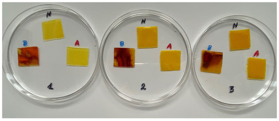 The pH responses of the composite films in contact with acid (A), neutral (N), and alkali (B) conditions. Abbreviations: (1) Composite No. 1; (2) Composite No. 2; (3) Composite No. 3.