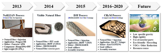 Currently, for the purpose of strengthening regulations and light weight, the proportion of plastic in automobile interior parts is rapidly increasing. This is also due to requirements for automotive interior and exterior parts that are complex, eco-friendly, and highly sensitive [1,2,3,4,5]. Figure 1 shows the eco-friendly and lightweight trends pursued by global automobile brands.