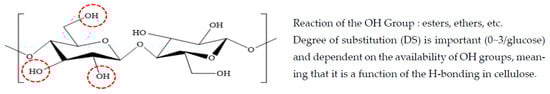 As shown in Figure 4, it is commonly accepted that natural cellulose has 70% crystalline and very good mechanical properties, but it is difficult to process due to the strong intermolecular bonding force and crystallinity from hydrogen bonding between the terminal OH groups. It is also difficult to mold because it decomposes before reaching the melting point [19,20].