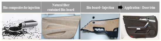 In this study, by-products generated in the manufacturing process were reused as raw materials. By removing impurities on the surface through a scouring process, the compatibility with the polymer substrate was increased in order to improve interfacial adhesion and to improve physical properties. In addition, a change in properties according to composition ratio was observed by blending a biofiller for plastic additives [22], registered as Korea Patent Technology 10-1962239, without requiring a separate surface treatment. As a base material of the biocomposite, a cellulose ester-based resin capable of injection molding based on cellulose was used in this study. A plasticized CA composition was prepared by melt blending an eco-friendly plasticizer to lower the glass transition temperature and enable injection molding. CA substrate and additive were manufactured as a composite in a single process through melt blending using a twin-screw extruder. Mechanical properties of biocomposite materials manufactured by melt blending, such as tensile strength, flexural strength, melt behavior, and thermal properties, were then evaluated to establish the optimal composition formulation and to evaluate their applicability as automotive interior materials in parts such as door trims and garnishes, shown in Figure 6.