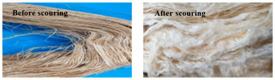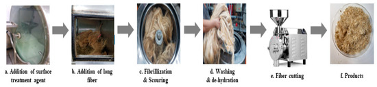 Since compatibility is reduced due to high hydrophobicity and impurities on the surface of natural fibers, impurities were removed from the surface through a process called refining, or scouring, as shown in Figure 7, to improve compatibility with the biopolymer substrate. In this study, alkali-based sodium hydroxide (NaOH) from Dae-Jung (Siheung, Korea) and natural enzyme α-amylase from Dong-A Petrochemical Co., Ltd. (Seoul, Korea) was used. By checking the properties and weight changes of natural fibers according to the content and composition of the refining agent, one product from which surface impurities were most effectively removed was selected. After removing impurities on the surface of natural fibers, reinforcing raw materials consisting of natural fibers of about 5 mm in length were obtained through a pulverization process.