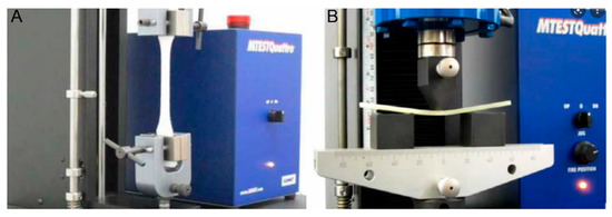 Comparison of the tensile strength (A) and flexural strength (B) measurement methods using a UTM.
