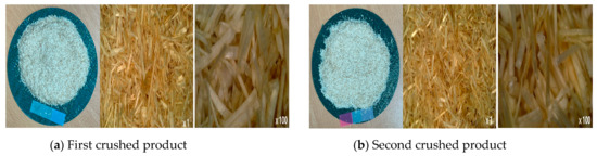 Figure 11 and Figure 12 show the appearance of Kenaf fibers before and after refining and final grinding. At this time, since the refined natural fiber is a long fiber, fiber particles were pulverized to secure mixability and uniformity with the polymer when manufacturing the biocomposite material. The size of the final fiber product used as an additive was measured as having an average length of 5 mm. Grinding was performed twice to compare the texture and size of each product. In the case of Kenaf, as a result of the second grinding test, only particles were smaller. The feel after final grinding was judged to be similar to that of primary grinding, and the primary crushed product was used as an additive.