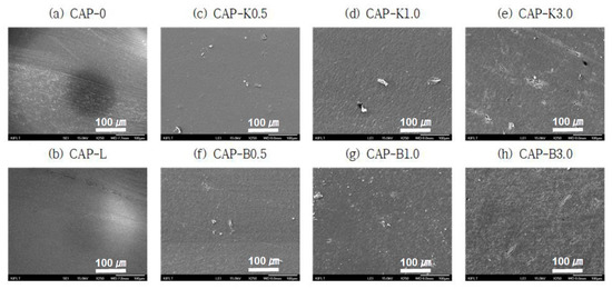 SEM images showing dispersibility of composites after adding biofillers (×250 magnification): (a) CAP-0; (b) CAP-L; (c) CAP-K0.5; (d) CAP-K1.0; (e) CAP-K3.0; (f) CAP-B0.5; (g) CAP-B1.0; and (h) CAP-B3.0.
