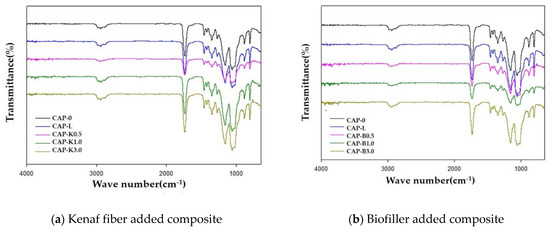 The FT-IR spectra of the composites, shown in Figure 15, show characteristic absorption peaks at 2900 (C–H stretch), 1750 (C=O stretch), and 1100–1050 cm−1 (C–O stretch), with concurrent disappearance of the OH stretching peak at 3650–3000 cm−1 due to the steric element. In particular, it was found that the intensity of the C–O stretching peak at 1100–1050 cm−1 increased with increasing amounts of biofiller.