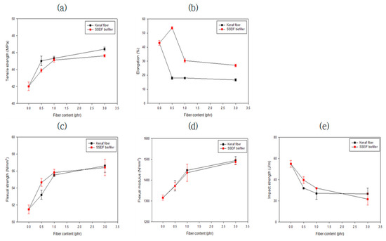 As a result of this experiment, it was confirmed that the fracture surface of the composition exhibited a very uniform shape when primary and secondary plasticizers and lactic acid, a viscosity modifier, were added to cellulose acetate propionate (Figure 14a,b). It was judged that interfacial separation did not occur due to excellent compatibility between the heterogeneous polymer matrix and the plasticizer. When natural fibers were used, some fibers were pulled out from the matrix. It was observed that the uniformity inside the polymer matrix decreased somewhat with an increase in the amount of additives. This might be because the interfacial bonding force between the bioadditive and the polymer matrix was somewhat weak. This trend was confirmed to be more severe in the case of biofillers than in surface-treated Kenaf fibers. In order to improve the poor interfacial interaction between the hydrophilic natural fibers and the hydrophobic polymer matrix, maleic anhydride (MAH) graft polymers are sometimes used as compatibilizers [30]. Therefore, in order to increase the interfacial compatibility between the polymer matrix and the natural fiber additive, it was determined that it was necessary to use a compatibilizer exhibiting polarity.