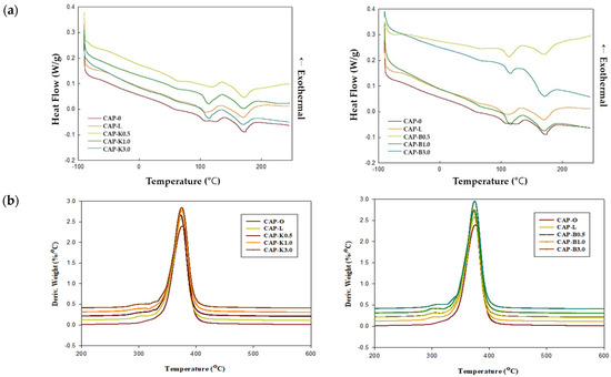 Biofiller particles distributed in the polymer matrix can affect thermal properties. Filler can change the micromorphology of the polymer and act as a nucleating agent, which can thus affect the shape, size, and crystallinity of the crystal. On the other hand, the polymer layer present on the particle surface has reduced mobility and thus a decreased crystallization rate. In this regard, thermal properties of the CA composition were investigated. Results are shown in Table 4 and Figure 17. When CAP482-20 is used as a polymer matrix, it is known that the melting temperature is 188–210 °C and the glass transition temperature is 147 °C. For the plasticized CAP composite, the glass transition temperature was measured to be around −44 °C and the melting temperature around 170 °C.