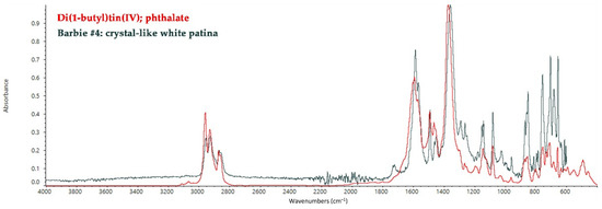 Barbie #4 shows a white crystal-like patina on the torso. The FT-IR ATR analysis detected di(1-butyl)tin(IV) phthalate, highlighting the presence of organotin compounds and plasticizers in the polymeric matrix (Figure 3). Organotin compounds have been commonly used as a thermal stabilizer for PVC compounds even before 1973 due to PVC’s sensitivity to thermal degradation during processing and use [38]. Phthalate-based plasticizers have been also widely added to improve the flexibility, processability, and durability of PVC [39]. Both organotin compounds and plasticizers tend to migrate to the surface of the polymer because they are usually not chemically bonded to the polymer chain [40,41]. Release of the plasticizer is one of the main causes of the deterioration of plasticized PVC, resulting in mass loss, embrittlement of the bulk, and the appearance of sticky exudates on the surface, which could appear as white deposits on the torso of Barbie #4 due to the presence of organotin compounds.
