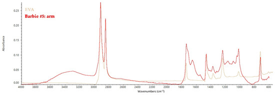 FT-IR ATR spectrum collected on the arm of Barbie #15 with the reference spectrum of EVA.