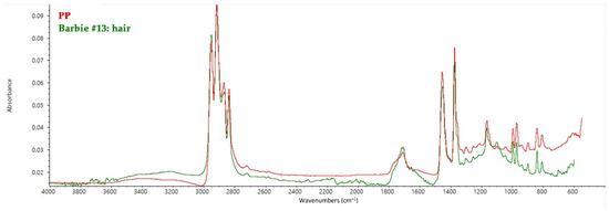Finally, Barbie #14 and 15 again have PVDC hair, whereas Barbie #13 has polypropylene (PP) hair, which is the reason for the green fluorescence emission when irradiated by UV light, as reported in paragraph 3.1 [45]. Characteristic peaks of PP can be observed at 2950, 2920, and 2870 cm−1 (C–H stretching), 1456 cm−1 (C–H bending), 1376 cm−1 (O–H bending), 1166 cm−1 (C=O stretching), 996, 973, 840, and 808 cm−1 (C=C bending) (Figure 7) [46].