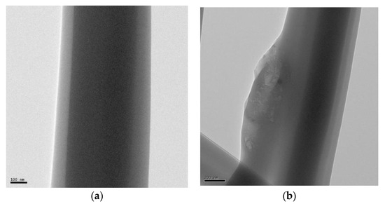 Figure 4 shows the TEM images of rPET and rPET/rGO polymer nanofibers with different rGO concentrations, and the presence of rGO can be observed in all rPet/rGO samples. The graphene sheets are sometimes exposed, which is critical to confer electrical conductivity to the rPET/rGO polymeric nanofiber mats [40].