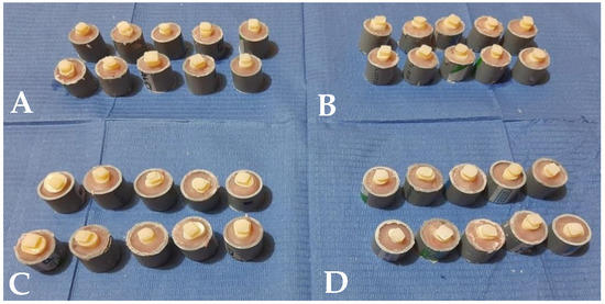 Sample units according to study group. (A) No dentin conditioning (Control), (B) dentin conditioned with 18% EDTA, (C) dentin conditioned with 35% H3PO4 and (D) dentin conditioned with 18% EDTA plus 35% H3PO4.