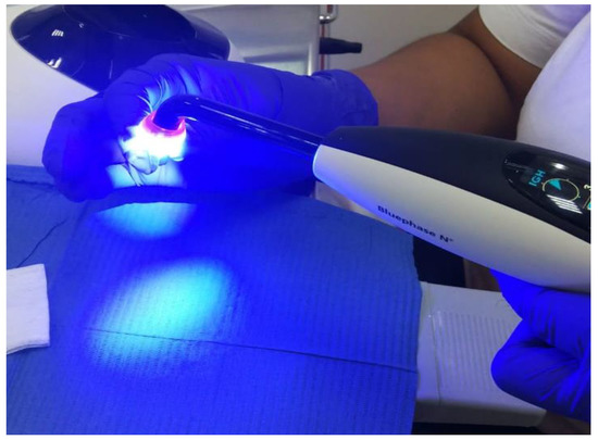 Figure 3. Light curing of Bulk-Fill resin blocks with LED unit. - Group 2: Dentin etching was performed with 18% EDTA gel for 90 s. Then it was washed with water for 10 s, and the excess moisture was dried with sterile gauze. Then, the adhesive was applied, and the resin composite was placed using the same procedure as group 1 [5].