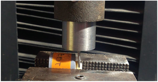 The roots of the 40 sample units were immersed in self-curing acrylic (Vitacryl, Vitalloy, Lima, Peru) in cylindrical molds to facilitate their handling in the shear test. The 40 prepared samples were subjected to a shear strength study using a universal testing machine (CMT-5L, 7419 series, Liangong Group, Jinan, Shandong, China) with digital software (Smart Test) at a crosshead speed of 0.75 mm/min. A 1 mm wide bevel cutting bar located on the upper head of the universal testing machine was used. This head, when descending at the indicated speed, came into contact with the sample resin–dentin junction located on the lower head. As the bar descended, it exerted a force (Newton) that was counteracted by the resistance (MPa) provided by the resin–dentin bond. This force reached its maximum value when the separation between resin composite and dentin occurred. To obtain the bond strength values in megapascals (MPa), the shear stress formula was used: R = F/A, where R is strength, F is the force in newtons obtained with the universal testing machine and A is the bond area expressed in mm2 and constitutes the worked area (Figure 4).