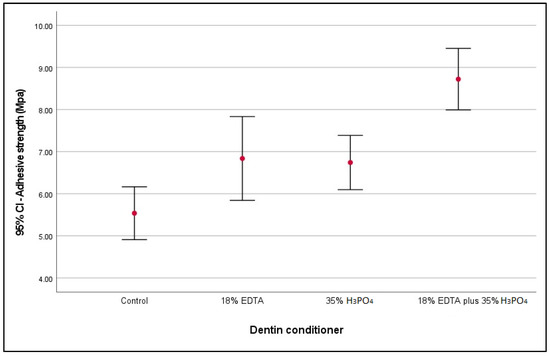 When comparing the adhesive strength according to the dentin conditioning applied, significant differences (p < 0.001) were observed between groups (Table 2). Therefore, multiple comparisons showed that 18% EDTA and 18% EDTA plus 35% H3PO4 presented significantly higher adhesive strength compared to the group that did not receive dentin conditioning (control) (p = 0.047 and p < 0.001, respectively). In addition, the group with 18% EDTA plus 35% H3PO4 conditioning showed significantly higher adhesive strength compared to groups conditioned with 18% EDTA (p = 0.002) and 35% H3PO4 (p = 0.001) (Table 3 and Figure 5).