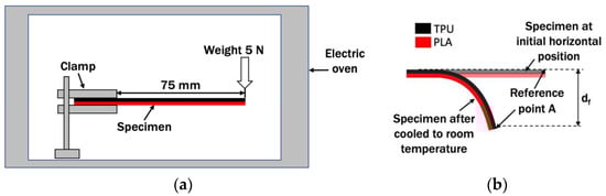 From the literature, no known standard was found to directly test the thermoformability characteristics of a multi-material layered plastic. In most cases, specific test methods such as bending and molding were set to address the needs of the products [4,24,27,28]. In order to evaluate the ease of the multi-material specimen to change shape under load and the thermoforming temperature for the purpose of this paper, a simple cantilever bending experiment was proposed. Specimens prepared in Section 2 complied with the ASTM D747-2 standard test method for the apparent bending modulus of plastics by means of a cantilever beam [33]. This standard was suited for determining relative flexibility of materials that are too flexible for test method ASTM D790. For this thermoforming test by bending, the PLA/TPU specimen was clamped horizontally as a cantilever with a 5 N load attached at the other end, as shown in Figure 2. This setup was proposed to simulate the typical thermoforming when the load is exerted at the end of the specimen to bend the specimen at the clamp point. The setup was then heated at a thermoforming temperature of 60 °C inside an electric oven for 5 min. Vise and weighting system were not used according to the ASTM D747-2 due to limited space in the electric oven. The specimen was removed from the oven and cooled at room temperature. The weight was then removed. The vertical displacement of the tip of the specimen at point A, df, was measured, as shown in Figure 2b. The thermoforming test by bending was repeated with different thermoforming temperatures, Tf, of 70 °C, 80 °C, 90 °C, 100 °C, and 110 °C. Tests for all conditions were repeated three times to obtain the averaged values of vertical displacement. With the same test procedure, a PLA/PLA control specimen was heated at 60 °C. The vertical displacement of the specimen was recorded and compared with those of PLA/TPU specimens.