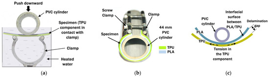 In the literature, the ends of male parts made of single material were pressed against a designer mold and their thermoformed shapes were discussed in molding tests [4,24]. This method was not suitable to evaluate the adhesion between the multi-material part, as it was designed for a single-material part. A thermoforming test by molding was proposed to investigate the interfacial surface bonding between PLA and TPU when being thermoformed to a circular shape at different temperatures. The PLA/TPU specimen was placed into temperature-controlled water for 5 min. The water was heated with an induction heater and its temperature was controlled at the desired thermoforming temperature with the heater’s built-in electronic controller. A digital thermometer was also used to ensure the water temperature was uniformly and correctly controlled. In this experiment, a similar specimen heating setup for a 3D-printed layered PLA/TPU shape memory experiment was adopted from Hasanzadeh et al. [25]. The specimen was then pressed into the clamp with a 44 mm diameter PVC cylinder, as shown in Figure 3a. The molding process was similar to the common three-point bending test for adhesion measurement. The TPU component, which is known to be more elastic than the PLA component, was assigned as the outer shell of the bending curve and subjected to tensile stress. It resulted in an opposite direction of the surface adhesion against the PLA component and possible delamination.