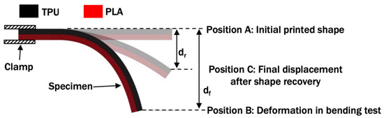 A shape memory test was carried out to investigate the ability of the deformed PLA/TPU specimens to return to their initial printed shape after being thermoformed at different temperatures. It is known that PLA and TPU alone possess some shape memory capacity. Various methods were presented by researchers, such as in [27,28]. However, there is no standard test to evaluate the shape memory ability of a thermoformed specimen or the size of the test specimen known to the author at this moment. Therefore, a shape memory test based on previous cantilever bending setup was applied in this paper. The specimens, which were bent in the previous bending, were heated for 5 min at a reheat temperature (Tr) of 60 °C. This temperature is just above the PLA glass transition temperature and below the TPU heat deflection temperature. This temperature was used in a previous study by Jing et al. to investigate the shape memory of PLA/TPU [34]. The new vertical deformation of the specimens, dr, as shown in Figure 4, were measured. This test procedure was also conducted for the bent PLA control. The shape recovery percentage (SR) was determined by Equation (2) [28]: