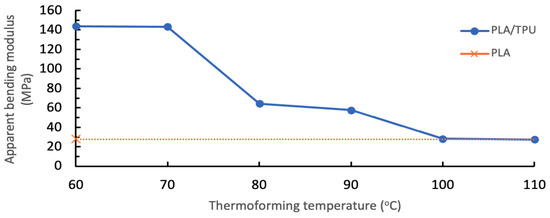 Apparent bending modulus for PLA/TPU specimens at different thermoforming temperatures and PLA/PLA control specimen at Tf = 60 °C.