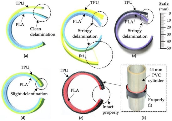 Figure 7 shows the multi-material specimens that were molded at different thermoforming temperatures and cooled at room temperature. It shows the shape of the specimens being released from the clamp and PVC pipe. The adhesion and shape retention accuracy after molding are observed and discussed. Figure 7a–d reveals that the adhesion at the interfacial surface of the PLA/TPU specimens failed during the molding at thermoforming temperatures between 60 °C and 90 °C. The delaminations between the TPU components from PLA components were observed immediately once the clamps were removed after the cooling process. This indicated that the delamination might have occurred during the molding or cooling process. During the molding process into circular shape, maximum shear occurred along the interfacial surface between the PLA and TPU components due to reactions that acted in the opposite directions. This was in line with the theory of mechanics of material related to a three-point bending of a beam such that the maximum shear stress, τmax, occurred at the neutral axis. After the cooling process, the TPU component restored most of its elastic properties. The elastic force of the TPU component increased as it was stretched farther along the PVC circular shape during the thermoforming test by molding. When being released from the mold, the TPU component tended to return to its original shape, while the thermoformed PLA component reacted to restrict the action of the TPU component. Due to these strong reactions, the interfacial surface bonding between the materials eventually failed and delamination between the two layers occurred.
