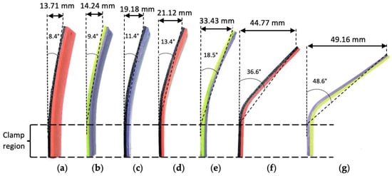 Comparison of PLA/TPU and PLA control specimens bent at different thermoforming temperatures: (a) Tf = 60 °C; (b) Tf = 70 °C; (c) Tf = 80 °C; (d) Tf = 90 °C; (e) Tf = 100 °C; (f) Tf = 110 °C; (g) PLA/PLA control specimen, Tf = 60 °C.