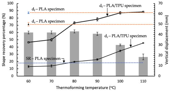 However, this shape recovery ability rapidly declined for the specimens being thermoformed at higher thermoforming temperatures of 100 °C and 110 °C, as shown in Figure 9. This trend is consistent with the finding by Wu et al., such that the higher deformation temperature results in a lower shape recovery ratio of the PLA specimens [45]. Lai et al. reported a significantly low shape recovery ratio of about 8% for their 50/50 PLA/TPU melt-blended specimen that was pre-deformed at 120 °C and underwent recovery at 60 °C [41]. The shape recovery percentage for the specimen bent at Tf = 110 °C approached the result of the PLA control specimen. This result showed that the shape memory ability of the PLA/TPU specimens was mainly contributed by the elasticity of the TPU layer. Once the TPU layer was thermoformed above its heat deflection temperature and lost its elasticity, the shape memory ability of the specimens decreased accordingly.