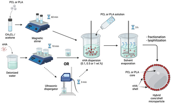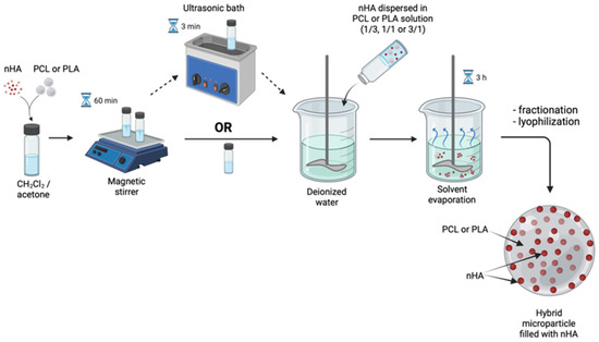 Hybrid microparticles filled with nHA within the volume of polymeric microparticles were fabricated using the nHA dispersion in 6 wt.% solutions of PLA or PCL in the CH2Cl2/acetone mixture as the oil phase. The amount of the dispersed nHA was varied by the polymer/nanoparticles weight ratios as 1/3, 1/1, or 3/1. nHA were dispersed within the polymeric solution using either a magnetic stirrer (200 rpm, 10 min) only or applying additional US treatment with an aim of ultrasonic bath, using Nordberg NU32D (35 kHz, 3 min) (Spain). The nHA-containing polymeric phase was added within the aqueous phase (mQ) and emulsified at the same conditions as indicated for the core/shell microparticles fabrication. The fabrication process of the polymeric microparticle filled with nHA is shown schematically in Figure 2.