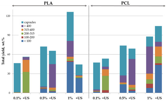 As a starting point of our research, we evaluated the effectiveness of nHA dispersed in the aqueous phase as stabilizers of the oil/water interface during fabrication of the polyester-based microparticles. Figure 3 represents the effect of concentration, pre-treatment conditions of the nHA water dispersion used as the aqueous phase, and the nature of the polymer dissolved within the oil phase on the total yield, mean size, and size distribution of the fabricated microparticles. As discovered, nHA were well-suited for the stabilization of the oil/water interface without the application of additional molecular emulsifiers. An increase in the nHA concentration within the aqueous phase led to an increase in the microparticle total yield, which could exceed 100 wt.% (total weight of components dissolved within the oil phase, i.e., polyester in this case) due to entrapment of nHA at the phase interface and, therefore, at the surface of microparticles after evaporation of solvents from the oil phase. As can be seen in Figure 3, preliminary US treatment of the aqueous phase gives no significant bonus on microparticle total yield. The US treatment led to a decrease in the content of the microparticles with a size below 100 μm. The fractions of hollow capsules were also lower than that when US was applied. The latter effect could be attributed to the destruction of nHA aggregates to individual nanoparticles, which led to the elimination of air bubbles responsible for air entrapment during microparticle processing [29].