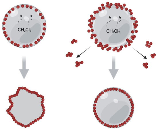 Solvent evaporation technique for the fabrication of filled microparticles. Created with BioRender.com (accessed on 8 September 2022).