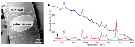 (a) SEM image of the cross-section of the PLA-based microparticle stabilized with 1 wt% of nHA without preliminary US treatment of aqueous phase; (b) Raman spectra of PLA (1) and from a cross-section of the PLA-based microparticle (2).