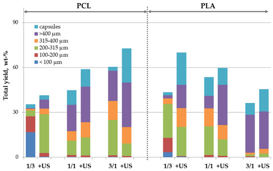 Hybrid microparticles consisting of the biodegradable polymer filled with nHA over the whole volume are a promising type of injectable carriers for non-invasive drug/cell delivery, but they could be also used as a starting material for fabrication of larger 3D scaffolds for bone tissue engineering via molding or additive technologies, such as laser sintering [34,35,43]. Composite microparticles also appear to be more suitable for such processing than polymeric ones [23]. The distribution of nHA over the whole volume of the polymeric microparticles could provide the constant supply of the mineral bioactive component during the polymeric scaffold degradation. To add nHA as a part of the microparticle core, they were dispersed within the oil phase, i.e., PLA or PCL solution, while deionized water was used as an aqueous phase. We were successfully able to fabricate the microparticles with a total yield ranging from 35 to 72 wt.% (Figure 8). The total yield was logically lower than that of microparticles fabricated using nHA within the aqueous phase since nanoparticles need to migrate from the oil phase volume to the interface first, so the duration of the stabilization process was longer. The mean particle size was logically lower in the case of microparticles made using higher nHA content within the oil phase, while the effect of the oil phase composition on the total yield was more complex and depended on the polymer nature as was also observed in the case of core/shell microparticles. US treatment of the oil phase led to an increase of the total yield of the fabricated microparticles, but mainly by increasing the yield of capsules.