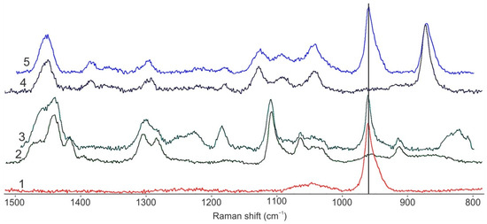Raman spectra of initial nHA (1), PCL (2) and PCL-based microparticles contained nHA at polymer/nHA ratio of 1/1 (3); initial PLA (4) and PLA-based microparticles contained nHA at polymer/nHA ratio of 1/1 (5).