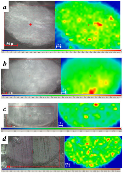 The distribution of components within microparticles was studied by using a dispersive Raman spectrometer (Nicolet Almega XR, Thermo Fisher Scientific, Waltham, MA, USA). Spectra and spectral maps were registered using an exciting laser with a wavelength of 532 nm. A microscopic 50× (n.a. 0.75) microobjective was used. A 5 µm step was used in the surface mapping mode measuring.