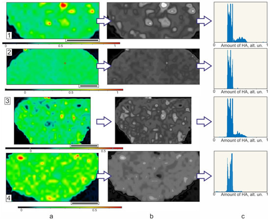 Raman maps (a) in color and (b) in grayscale form, and (c) calculated histograms of the nHA distribution within the volume of PCL microparticles made at polymer/nHA ratio as 1/1 without (1,2) and with (3,4) preliminary US treatment of oil phase.