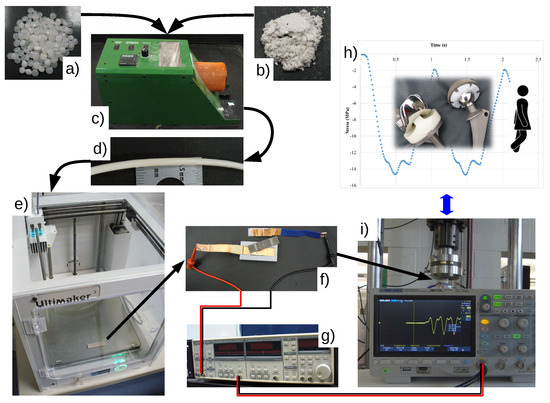 Materials, fabrication, and testing: (a) PVDF, (b) ZnO, (c) compounding and extrusion of the ZnO-PVDF nanocomposite into (d) 2.8 mm filaments were vacuum dried at 40 °C for 40 min, (e) 3D printing of test specimens, (f) electrically insulated test support with copper electrodes where the sample painted with conductive pain will rest, (g) lock-in amplifier connected directly to the test support electrodes, (h) walking profile with a 2 mm amplitude programmed into an MTS testing frame, and (i) measuring voltage generated during testing with an oscilloscope.