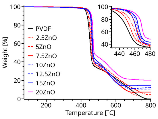 The glass transition temperature (Figure S1), measured using a differential scanning calorimetry, increased as a function of the percentage of ZnO content of the samples. In agreement with existing literature, smaller changes were noticed for samples with less than 7.5% of ZnO, which presented T at −40.1 °C and 30.9 °C for pristine PVDF and 7.5% of ZnO, respectively. 20% ZnO samples showed the highest T at −7.5 °C (Figure S1). The increasing T can be explained by the lower molecular mobility of the PVDF chains induced by the ZnO nanoparticles’ and the crystallinity of ZnO [42].