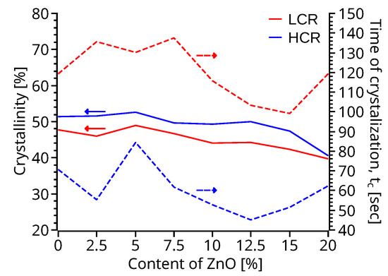 The crystallinity of PVDF and ZnO-PVDF nanocomposite samples (Figure 3) was calculated using Equation (1) with a melting enthalpy of 100% PVDF equal to 104.6 Jg−1, and heat flow equal to the area under the crystallization peak (Figure S2) [43,44,45]. The overall crystallization time (Figure 3) was calculated by subtracting the time at the crystallization peak temperature from the on-set temperature-time (Figure S2). The effect of the cooling rate on the crystallinity and time of crystallization was analyzed by cooling the samples at two different rates: a LCR of 5 °C min−1 and a HCR of 30 °C min−1.