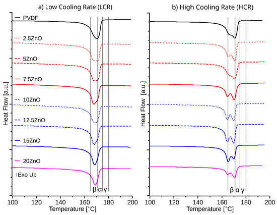 Following the crystallization cycles, both high and low cooling rate samples were melted at 5 °C min−1. DSC melting cycles following LCR exhibited a lower temperature shoulder or a decrease of the melting temperature, with respect to pristine PVDF, 170.3 °C, for all ZnO-PVDF samples above 5% of ZnO (Figure 4). Samples with 7.5% of ZnO presented the lowest melting temperature at 167.9 °C for LCR samples. Instead, HCR produced a double melting peak or a shoulder of the main melting temperature peak for all samples. This lower-temperature melting peak decreased with the increase of ZnO content until reaching a minimum with 15% of ZnO content at 164.4 °C, which is the melting temperature of β-phase of PVDF. Sencadas et al., Harstad et al. and Soin et al. reported the formation of a shoulder and a second peak at 165 °C to be proportional to the increment the PVDF β-phase [48,49,50]. Literature also indicates that the γ-phase have a 175 °C < Tm < 175 °C, the α-phase have a 172 °C < Tm < 180 °C, and the β-phase has a 165 °C < Tm < 172 °C [12,14,16,50,51]. Both HCR and LCR samples, present no visisble peaks or shoulders at temperatures above 175 °C, suggesting a minimum presence of the γ phase on the ZnO-PVDF nanocomposite [51].