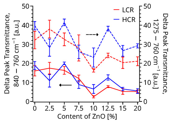 FTIR measurements (Figure S5) were also performed on the upper surface of all the 3D printed DMA specimens. These spectra exhibit a reduction of the transmittance on the 400–500 cm−1 band assigned to the characteristic stretching mode of Zn-O bond proportional to the ZnO percentage in the sample. In addition (Figure 5), the α peak, 760 cm−1, increases its transmittance as a function of the ZnO percentage, reaching a maximum at 10–12.5% of ZnO, while the β − γ peak, 840 cm−1, and the β peak, 1275 cm−1, decrease their transmittance proportionally to the percentage of ZnO. A minimum transmittance for the peak of the 840 cm−1, and 1275 cm−1 peaks was found at concentrations of 10–12.5% of ZnO. Similarly to the DSC samples, there is no apparent change to the 1234 cm−1 γ peak. When comparing the changes in transmittance, there is also a reduction proportional to the ZnO percentage with a maximum of 80% reduction (Figure 5) of the α minus β ratio with respect to the pristine PVDF for the 10% ZnO samples. Due to the smaller difference in cooling rates of the 3D printed samples compared to the DSC samples, there are no statistical differences between the two printing profiles.