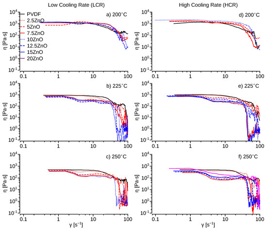 Lower shear viscosity and elasticity have been related to ease of 3D printing and quality [53,54]. The viscosity curves (Figure 6) obtained from the rheometer show a broad plateau of constant shear viscosity, e.g., below shear rates of 10 s−1 for pristine PVDF. Above shear rates of 10 s−1, there is a significant reduction, e.g., one order of magnitude, of the shear viscosity as a function of the temperature. There are no significant differences between the HCR and LCR samples using pristine PVDF. However, ZnO-PVDF nanocomposite samples exhibit increased shear stress (Supporting Information Figure S5) and shear viscosity (Figure 6) at temperatures below 200 °C. Suggesting, a reinforcing effect due to the ZnO nanoparticles. This effect also increased pressure on the extruder for ZnO concentration above 15%, resulting in a reduction of the extrusion speed to produce a uniform filament. However, at higher temperatures, above 225 °C, ZnO produced a reduction of the shear viscosity of ≈678 and ≈827 Pa·s for the LCR and HCR, respectively, at lower shear rates of ≈2 s−1 than the pristine PVDF. The thinning effect of the ZnO is more significant with HCR of PVDF nanocomposites, reaching a minimum shear viscosity of ≈68 Pa·s, and shear stress of ≈680 Pa, at 250 °C and 10 s−1, for a ZnO concentration of 7.5–12.5%. The ZnO thinning effect can be attributed to the ZnO nanoparticle size being smaller than the polymer’s RMS radius of gyration as seen before by Mackay et al. and Kairn et al. [55,56]. However, as the concentration of ZnO increases above 12.5%, the shear viscosity (Figure 6) and shear stress of PVDF (Figure S6) began to increase. The filler-like behavior is attributed to the large concentration of ZnO and agglomeration of the nanoparticles (Supporting Information Figure S3). Similar thinning behavior, for <12.5% ZnO, and filler-like behavior, for >12.5% ZnO, is present in both the LCR and HCR samples for temperatures above 225 °C. Due to the thinning effect of ZnO, PVDF-ZnO nanocomposites have significant lower viscosities, ≈10 Pa·s, than pristine PVDF, ≈100 Pa·s, at higher shear rates, e.g., ≥100 s−1. Thus, making PVDF-ZnO nanocomposite a better option for FDM 3D printers since typical shear rates at the nozzle are in the range of 102–103 s−1 depending on the printing filament speeds [54].