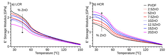 DMA specimens of both 3D printing profiles show a storage modulus (Figure 7), an order of magnitude higher than the loss modulus (Figure S7). Hence, material elasticity remains dominant at lower temperatures. In the high-temperature region, the difference in the magnitudes of the two moduli reduces to an extent, yet the loss modulus remains lower than the storage modulus. In the LCR samples, E’ (Figure 7a) and E” (Figure S7a) decrease with the increasing percentage of ZnO. A similar trend was observed in the material viscosity (Figure 6). The HCR specimens show a proportional elastic modulus (Figure 7b) and loss modulus (Figure S7b) to the percentage of ZnO. The stiffening effect could be due to the lower time to crystallization (Figure 3), good dispersion of the nanoparticles in the matrix, and the high surface area of the ZnO particles as reported by Cao et al. [57]. The increment in the storage modulus (Figure 7b) indicates that HCR condition with ZnO-PVDF nanocomposite material creates higher resilience to high temperatures. The opposite trend observed in LCR specimens (Figure 7a) indicates that lower cooling rates hinder the stiffening effect of ZnO nanoparticles. Similar results were obtained by Flyagina et al. [58]. The larger crystallites may explain the softening effect that slow cooling has on ZnO-PVDF nanocomposite due to the longer time to crystallization of ZnO-PVDF nanocomposite (Figure 3).