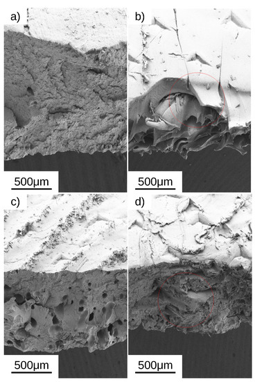 SEM micrographs of representative tensile specimens 3D printed with a [45°, 135°] infill direction: (a) LCR pristine PVDF, (b) HCR pristine PVDF, (c) LCR of 10% ZnO-PVDF, and (d) HCR of 10% ZnO-PVDF. The red circles shows elongation characteristic of the ductile failure of the HCR sample.